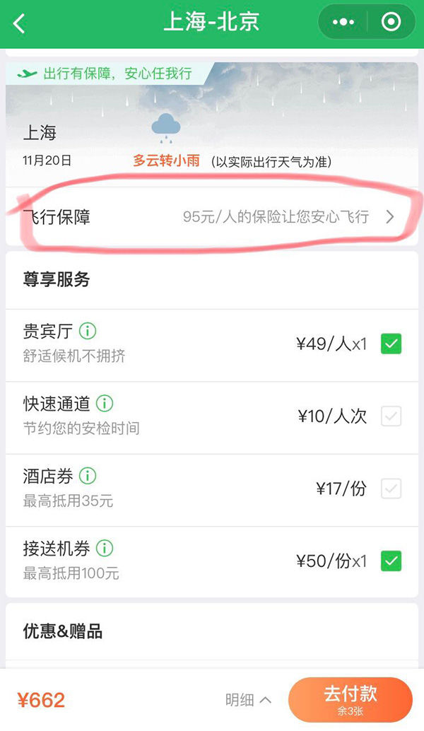 点开“飞行保障”后的二级界面,95元保险被自动勾选