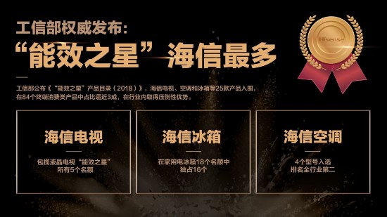 究竟是哪个品牌的家用电器最节能环保?近日,工信部正式公布了《“能效之星”产品目录(2018)》。在最终入选的84个终端消费类产品名单中,海信电视、空调和冰箱等25款产品入围,数量最多,占比逼近3成,在行业内取得压倒性优势。液晶电视仅有的5个名额,全部由海信电视包揽,家用电冰箱的18个名额,海信(含海信科龙)更是霸占了16个。
