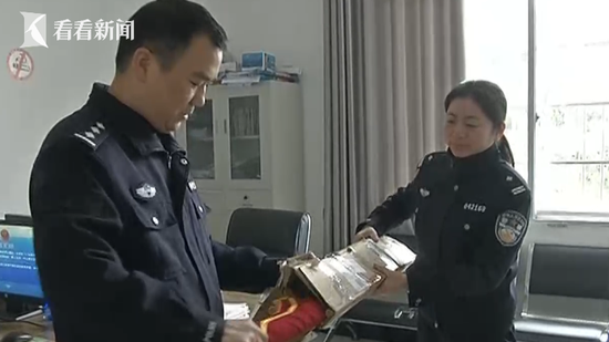这就是民警易理星收到的包裹,从表面的包装上看没什么特别,只是一个长形的包装。不过他和同事一起打开包裹后,却发现里面装的竟是一面写着“廉明高效、热情服务”的锦旗。