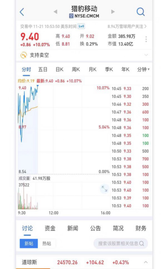 Q3财报发布后,猎豹移动股价高开高走,开盘后一小时后涨幅达10.07%,截至收盘,股价达9.36美元/股,全天涨幅接近10%。