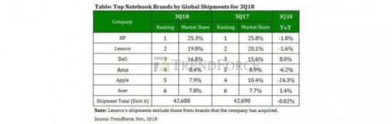 根据外媒 9to5Mac 的报道,来自 TrendForce 的最新数据显示,苹果笔记本电脑的市场份额在 2018 年第三季度出现了下滑。 TrendForce 表示,在排名方面,苹果已经从去年第三季度的第四名跌到了第五名。