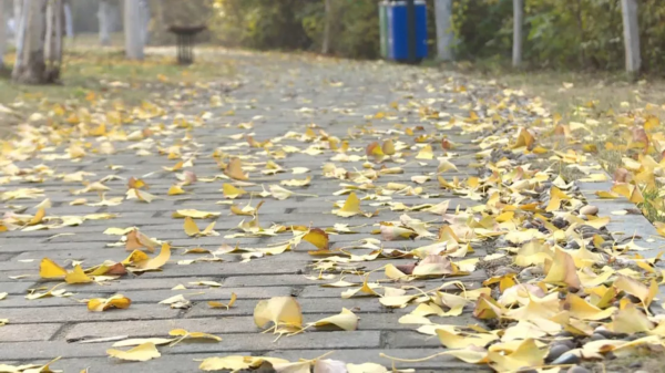 环卫工李银龙说:“在我这个区域内,今天早晨起来我扫了好多趟,扫了两桶半垃圾,落叶特别多。”