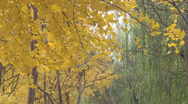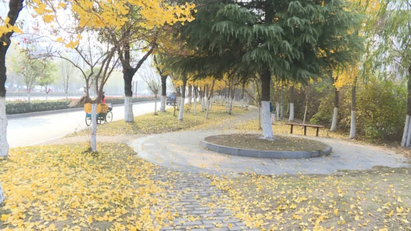 文学南路两旁的银杏早已变黄,一阵寒风吹过,枝头的银杏叶飘荡到绿化带、人行道上,遍地金黄形成冬日里的一道风景线。
