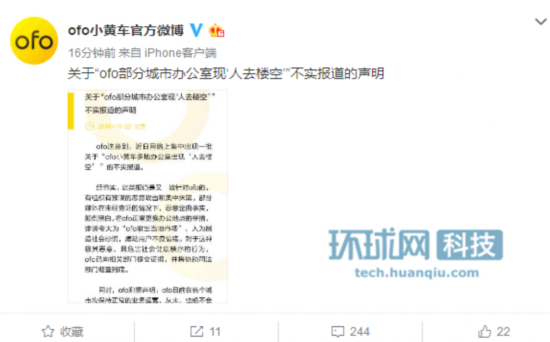 【环球网科技 记者 林迪】11月22日上午,ofo官方发布声明称,近日网络上集中出现一批关于“ofo小黄车多地办公室出现‘人去楼空’ ”的不实报道。另外,ofo已向相关部门提交证据,并将协助司法部门彻查到底。