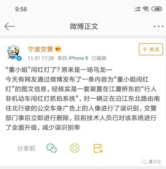 不过,事后宁波交警在官方微博上进行了回应,他们核实了一下发现,这套“行人非机动车闯红灯抓拍系统”对公交车广告进行了误识别,目前已经删除了这条闯红灯信息,技术人员已经对该系统进行了全面升级。