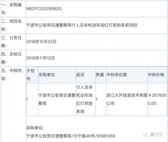 根据宁波市公共资源交易中心公开的信息,这个系统是宁波市公安局交通警察局今年11月12日采购的,供应商叫做“浙江大开信息技术有限公司”,价格是267.8万元。