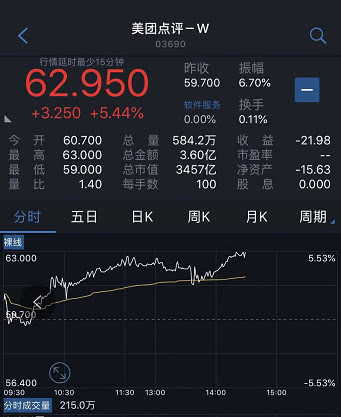 腾讯科技讯 11月22日,美团点评股价无视市场负面传闻,今日低开高走,截至发稿报价62.95港元,较前一交易日上涨5.44%。