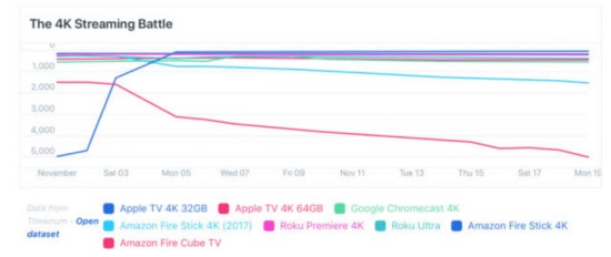 在4K流媒体设备方面,亚马逊仍然是无可争议的领导者,它的售价34.99美元的Fire TV Stick 4K销量排在第一名。排在第二名的是4K 32GB版苹果电视,尽管它的售价高达179.99美元。排在第三名的是Roku Premiere 4K,售价39.99美元。