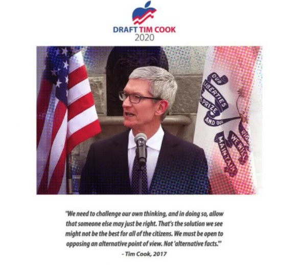 对于库克竞选总统的传闻,Definers在网上发起了一场令人惊讶的运动,将苹果首席执行官提升到2020年总统大选潜在候选人的水平。