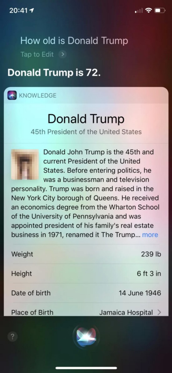 媒体推测,有人正在编辑与特朗普相关的维基百科页面,或者做手脚欺骗算法,让Siri提供了这样一张照片。