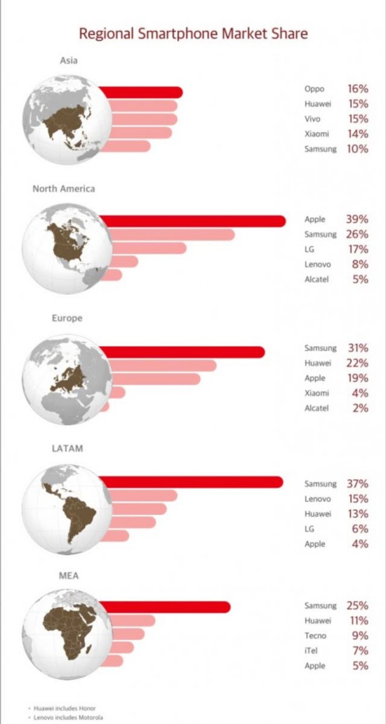在亚洲市场方面,OPPO为其贡献了16%份额,占据榜首位置。紧随其后的是华为(15%)、VIVO(15%)和小米(14%),韩国三星在该市场的份额则缩水至10%。
