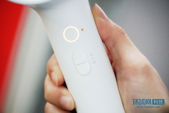 米家水离子吹风机开机默认是热风模式,按键灯显示橙色;按压按键可以切换为蓝橙循环闪烁的冷热循环风和蓝色长亮的冷风模式。