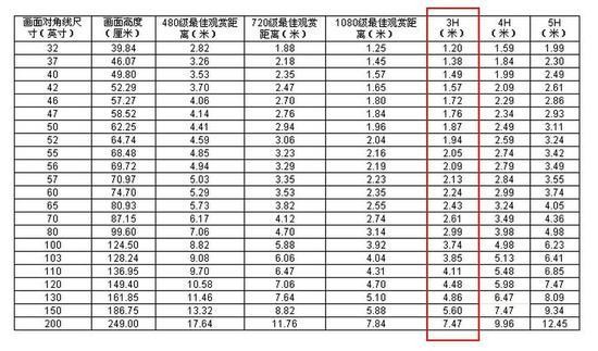 一定意义上来说,电视往大了买没错,另外电视的最佳观看距离与观看内容的清晰度有关,上面结合了内容分辨率的公式值得参考。(最后三列3H、4H、5H中的“H”指的是电视屏幕的高度,可以看出3H与左侧的1080级数据非常接近,由于目前有线电视的高清信号及网络节目大多最高能达到1080P清晰度,该列数据比较有参考意义,其中75英寸电视的最佳观看距离在2.61米-2.99米之间,符合很多家庭的观看场景)