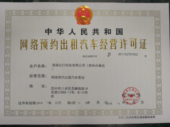 2018年11月23日消息,近日贺州市交通运输局向滴滴出行贺州办事处颁发了《网络预约出租汽车经营许可证》,这是滴滴在广西壮族自治区取得的第四张经营许可证。贺州成为了继南宁、贵港、钦州后又一座获得网约车经营许可证的城市。
