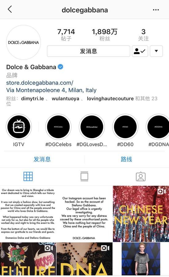 截止到目前为止,杜嘉班纳的三大海外账号截图如下,最新动态依然是其21日对上海大秀取消的回应。