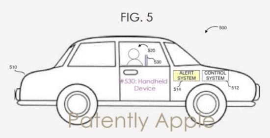 苹果的专利图示中,包括行车环境、汽车、驾驶员和一台手持设备。实际应用中,手持设备可以是手机、平板、或笔记本电脑。图示中显示了多种警报形式,如 “控制汽车!”和“注意周围!”