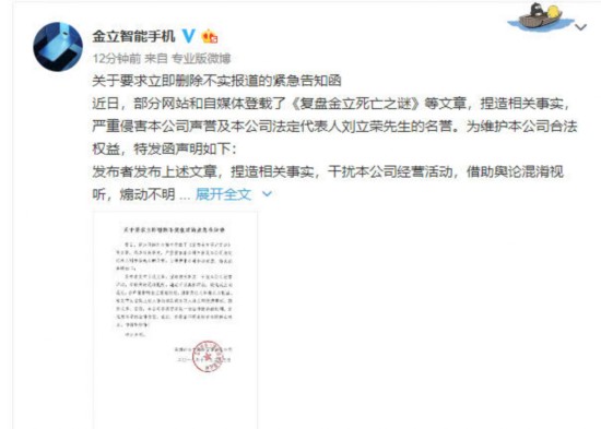 23日下午,金立发布微博回应,刘立荣赌博输了100亿为“捏造相关事实”。