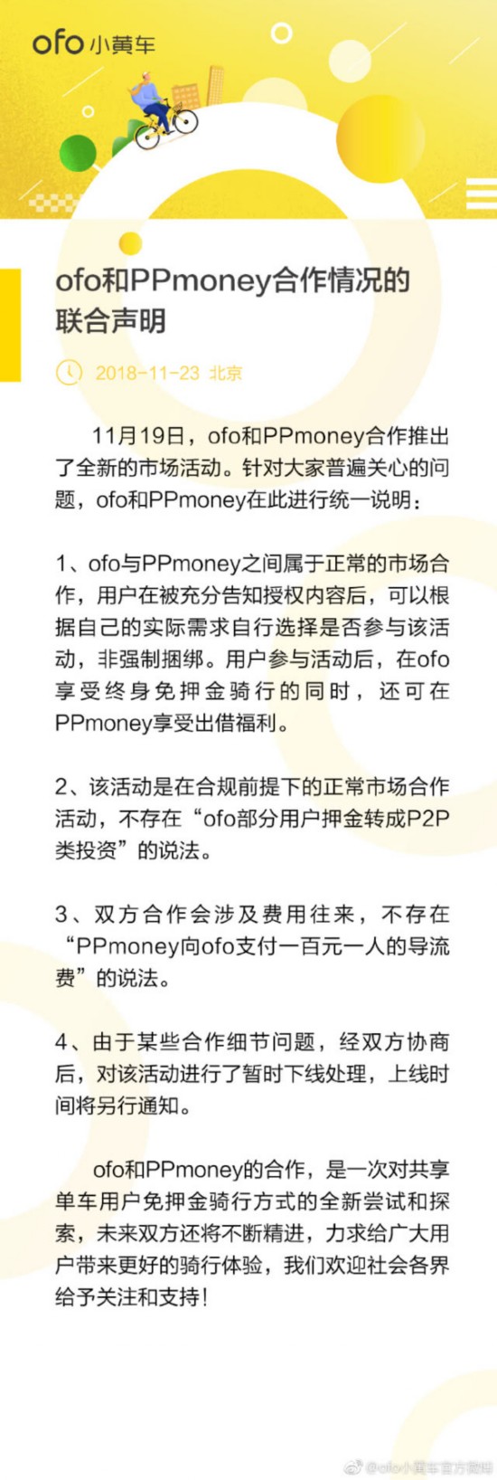 腾讯科技讯 ofo和PPmoney今日就合作情况发布联合声明:不存在“ofo部分用户押金转成P2P类投资”的说法。