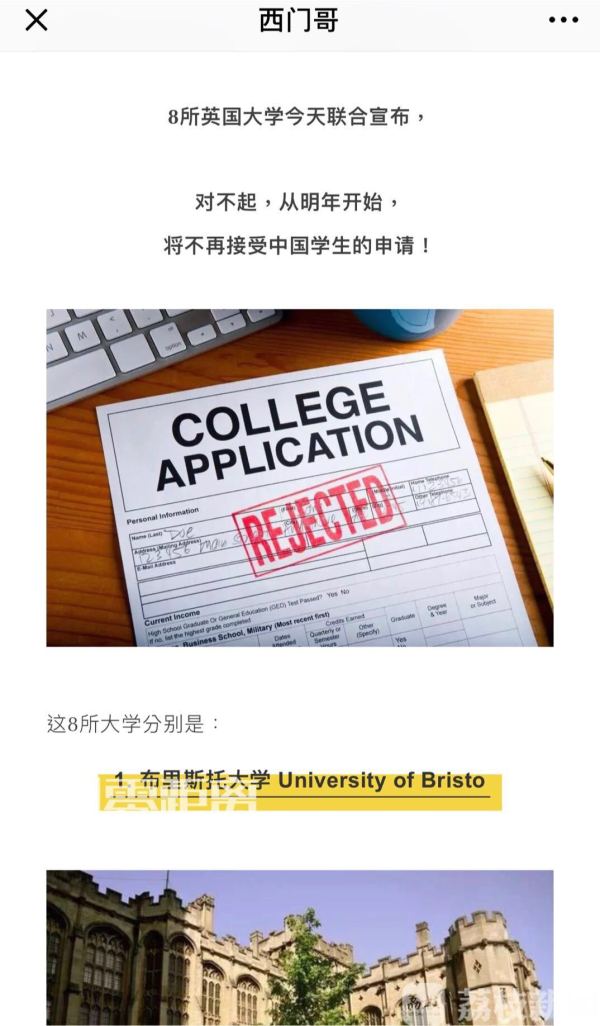 流传的网络文章中写道:杜伦大学、利兹大学、曼彻斯特大学等8所英国大学联合发布信息,表示明年开始不再接受部分中国学生的申请。