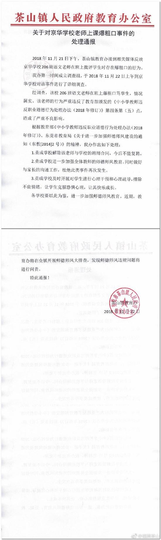 11月22日,茶山镇宣传办公室发布落款为该镇教育办的《关于对京华学校老师上课爆粗口事件的处理通报》,其中称:经调查,该校206班语文老师在班上爆粗口骂学生,情况属实。 该老师的行为严重违反了教育部颁发的《中小学教师违反职业道德行为处理办法(2018年修订)》第四条第(五)点,造成了严重不良影响。