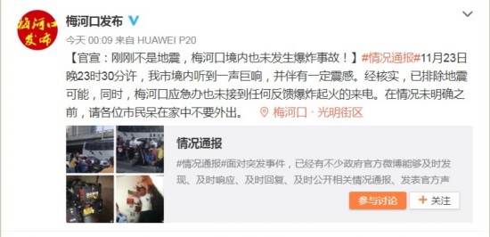 中新网11月24日电 23日晚23时30分许,吉林省梅河口市境内听到一声巨响,并伴有一定震感。24日凌晨,梅河口市人民政府新闻中心官方微博发布消息称,经核实,已排除地震可能,同时,梅河口应急办也未接到任何反馈爆炸起火的来电。