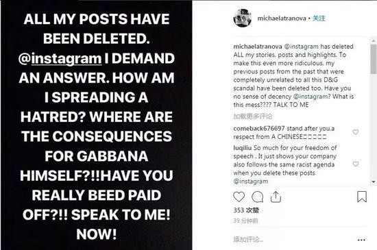 然而,曝光Stefano Gabbana辱华言论后,Michaela账号上的内容却因为“散布仇恨言论”而被平台删除。就连自己以前发的那些跟该事件无关的内容也被删除。Michaela质疑道,Gabbana自己的言论后果还没看到,自己账号倒被限制,平台是否被买通,要求给出说法。据内幕网(insider)报道,对此,Instagram拒绝评论。