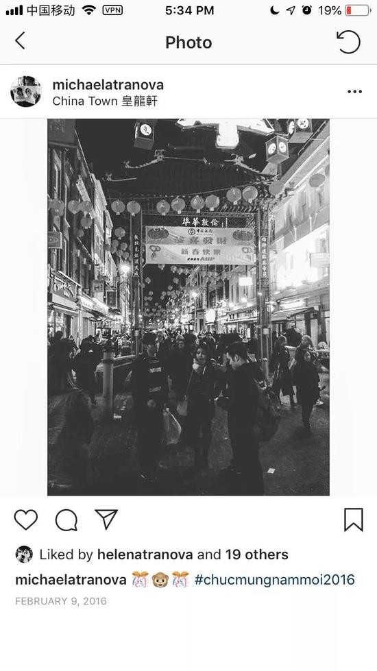 Michaela在一张去伦敦唐人街的照片中,用越南语发文称“新年快乐”。图片来自其Instagram账号