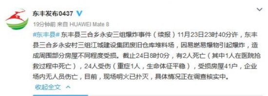 中新网11月24日电 据吉林省东丰县互联网信息中心官方微博“东丰发布0437”通报,11月23日23时40分许,东丰县三合乡永安村三组江城建设集团废旧仓库堆料场,因易燃易爆物引起爆炸,造成周围部分房屋不同程度受损。