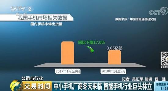 中国信息通信研究院的数据显示,2018年1-9月,国内手机市场出货量3.05亿部,同比下降17%。