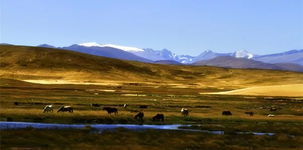 日照当头时,远处红色的山体,近处牛羊成群的草场,澄清如镜的湖泊共同呈现出一幅色彩斑斓、俏丽灵动的油画作品。