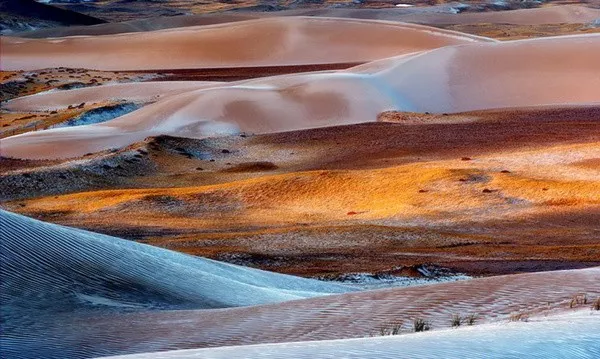 清晨时分,碧空如洗。阳光照射在沙丘表层凝结着的冰霜上,反射出一个绚丽多彩的世外仙境。
