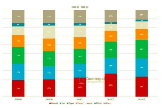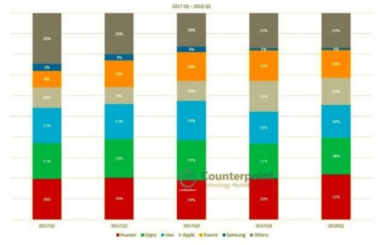 调研机构Counterpoint近日发布的调研数据显示,2018年第三季度三星的全球市场份额是19%,依然处于领先地位,但华为已经超越苹果以14%的占有率位居第二。而在中国市场中,华为则以23%的市场份额遥遥领先,而三星则跌出了前六,远不及排在华为后面的vivo、OPPO、小米,而在今年第一季度三星还占有中国市场的1%市场份额,以此来看,三星目前在中国市场的份额可能不足1%。