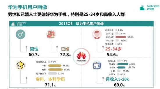相反,华为手机用户一般是年龄在 25 - 34 岁之间的已婚男性,拥有文凭或学士学位,月收入在5000 - 20000元之间。研究还发现,华为用户中有很大一部分是有房有车人士,而苹果用户在这方面则穷的比较彻底。Mobdata没有透露参与这项研究的受访者人数。