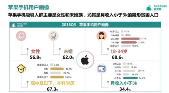 这家总部位于上海的公司还发现,大多数 iPhone 用户都是18岁至34岁的未婚女性,她们毕业时只有高中文凭,月收入不到3000元。她们被认为是一个被称为“隐形贫困人口”群体的一部分——这些人光鲜亮丽的外表与他们实际的资产不相匹配。