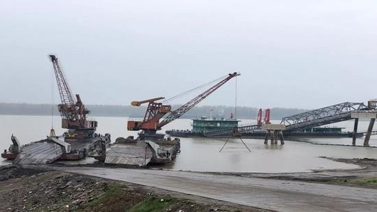 ▲安庆沙漠洲港埠码头的一个泊位正在被拆除。新京报记者 王文秋 摄