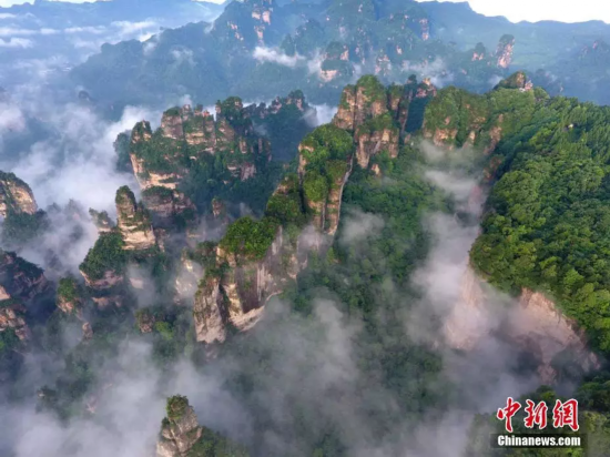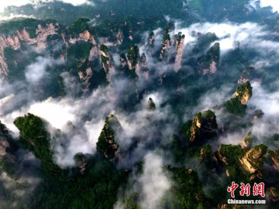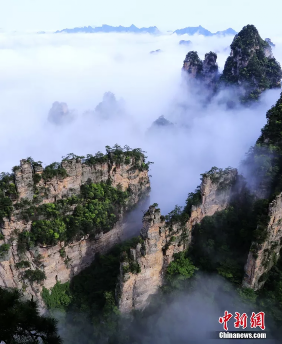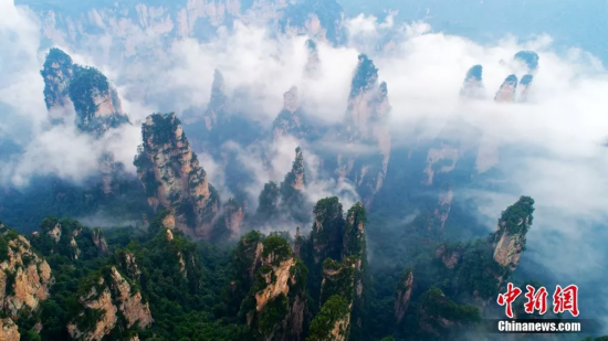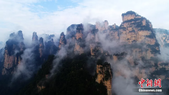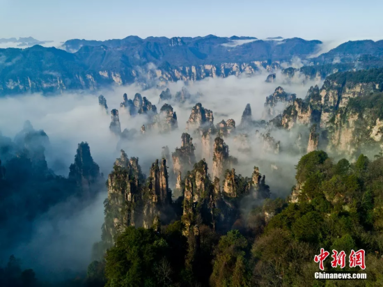 云雾围绕连绵峰峦,天门山仿佛“悬浮”空中。向韬摄