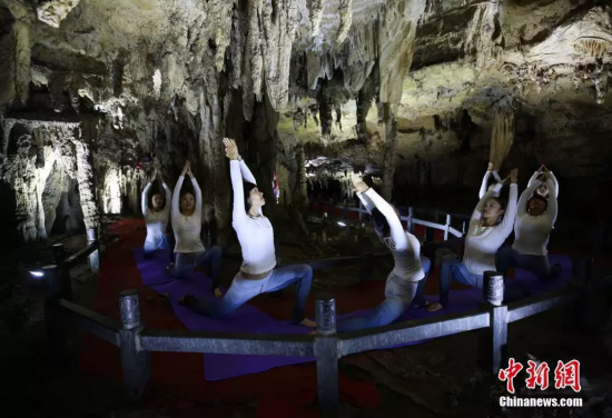 瑜伽爱好者在黄龙洞内练习瑜伽。吴勇兵摄