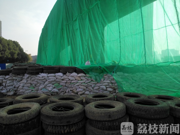 记者看到桥上蒙上了沙布,地面堆了好几堆装着泥土的袋子,袋子上面放了几层轮胎,桥墩上裹了竹筏,还裹了铁丝网。爆破员告诉记者,桥上蒙纱布,防止灰尘扩散。地上放轮胎,减少桥面落下来的冲击力,保护路面里面的管道和电缆。桥墩包着铁丝网和竹筏,目的是防止石子蹦出去。