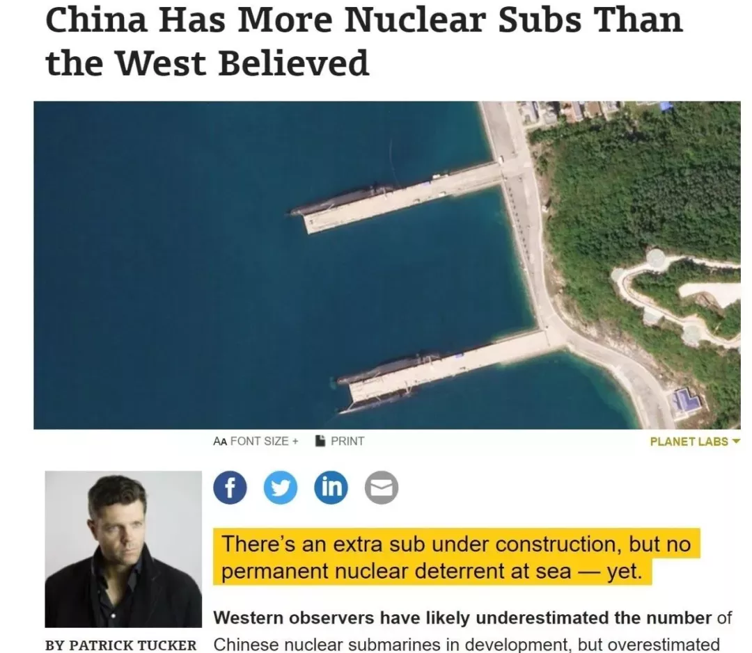 “防务一号”(Defense One)网站11月20日发布了题为《中国拥有的核潜艇多于西方此前判断》的文章,其引述美国米德伯里国际研究所分析人员的观点称:该研究所从商业卫星公司“行星实验室”获得了自2017年7月至2018年10月期间连续244天的卫星图片。根据这些图片判断,在大约同一时间内,中国有5艘被称为晋级或094型的战略核潜艇出现在两个地点——3艘在一处海军基地,2艘在一处造船厂的码头。