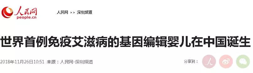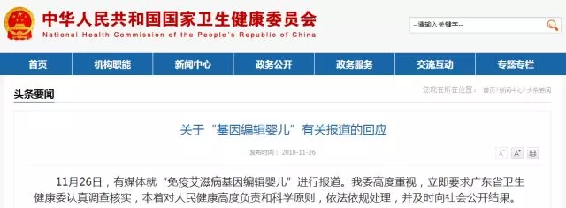 11月26日晚,国家卫健委回应"基因编辑婴儿"一事:11月26日,有媒体就“免疫艾滋病基因编辑婴儿”进行报道。我委高度重视,立即要求广东省卫生健康委认真调查核实,本着对人民健康高度负责和科学原则,依法依规处理,并及时向社会公开结果。