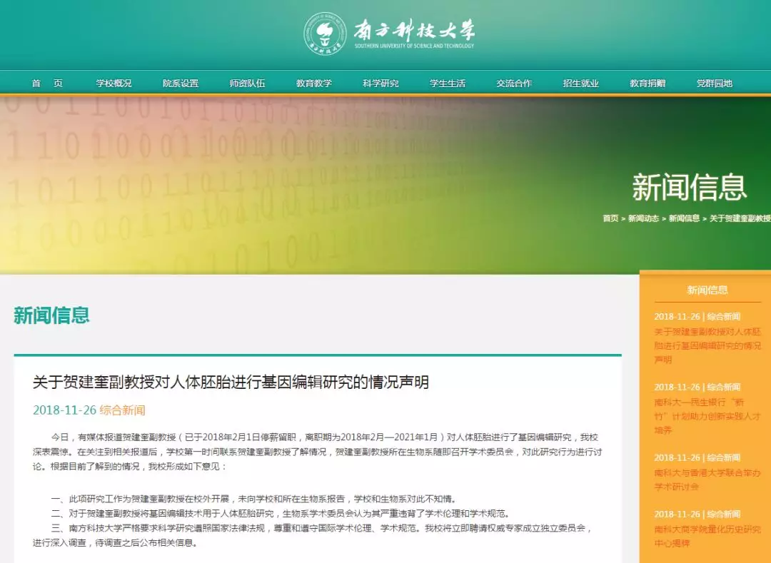 南方科大对基因编辑婴儿不知情: