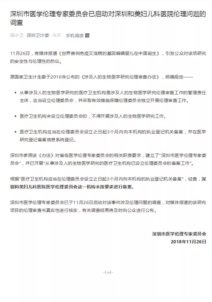 深圳市医学伦理专家委员会已于11月26日启动对该事件涉及伦理问题的调查,对媒体报道的该研究项目的伦理审查书真实性进行核实,有关调查结果将及时向公众进行公布。
