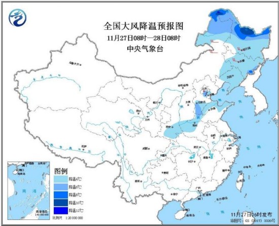 中央气象台11月27日06时继续发布大风降温预报:27日至28日早晨,内蒙古东北部、黑龙江北部等地降温幅度为6~8℃,局地降温可达10~12℃。内蒙古东部、东北地区西部等地有5~6级以上大风(见图2)。新疆北部、甘肃中部、陕西关中等地的部分地区有扬沙或浮尘天气。