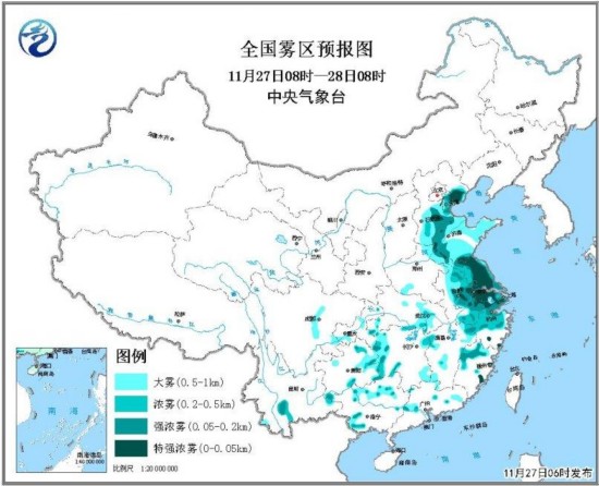 27日早晨至28日早晨,华北中东部、黄淮东部和南部、江淮、江汉平原等地的部分地区有大雾,其中河北东部、山东西南部、安徽东部、江苏、上海、浙江北部等地有浓雾或强浓雾,局地有能见度不足50米的特强浓雾(见图1)。因此,中央气象台今日06时继续发布大雾橙色预警。