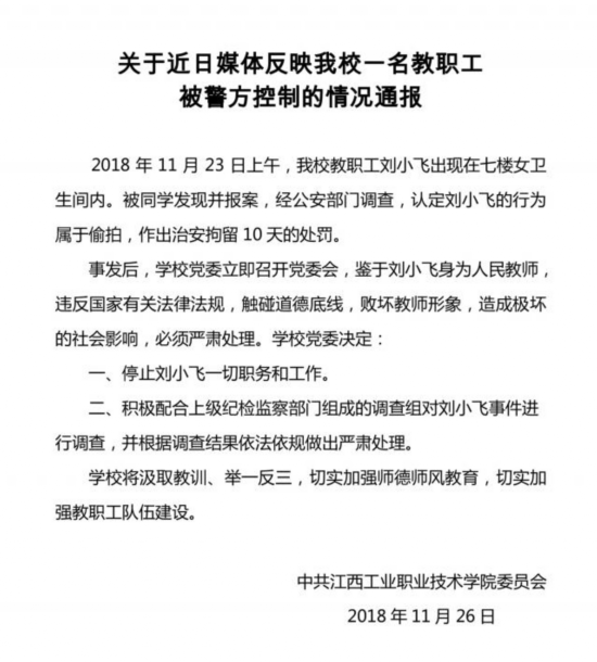 26日晚,江西工业职业技术学院官网通报称,11月23日上午,我校教职工刘小飞出现在七楼女卫生间内,被同学发现并报案,经公安部门调查,认定刘小飞的行为属于偷拍,作出治安拘留10日的处罚。