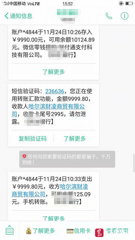 当对方提出要帮其将支付宝内剩余的钱转到卡上时,莫女士的手机也收到了一条验证码短信。对方则不断催促其将验证码告知,以方便快速退款。“当时也没有想那么多”,莫女士便将验证码告知给了对方。