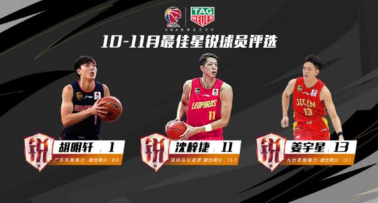 腾讯体育11月27日讯 CBA前15轮战罢,联赛也刚刚进行完一个月的时间,CBA官方公布了10-11月最佳星锐球员候选人名单,3名球员分别是深圳男篮的沈梓捷、吉林男篮的姜宇星和广东男篮的胡明轩。
