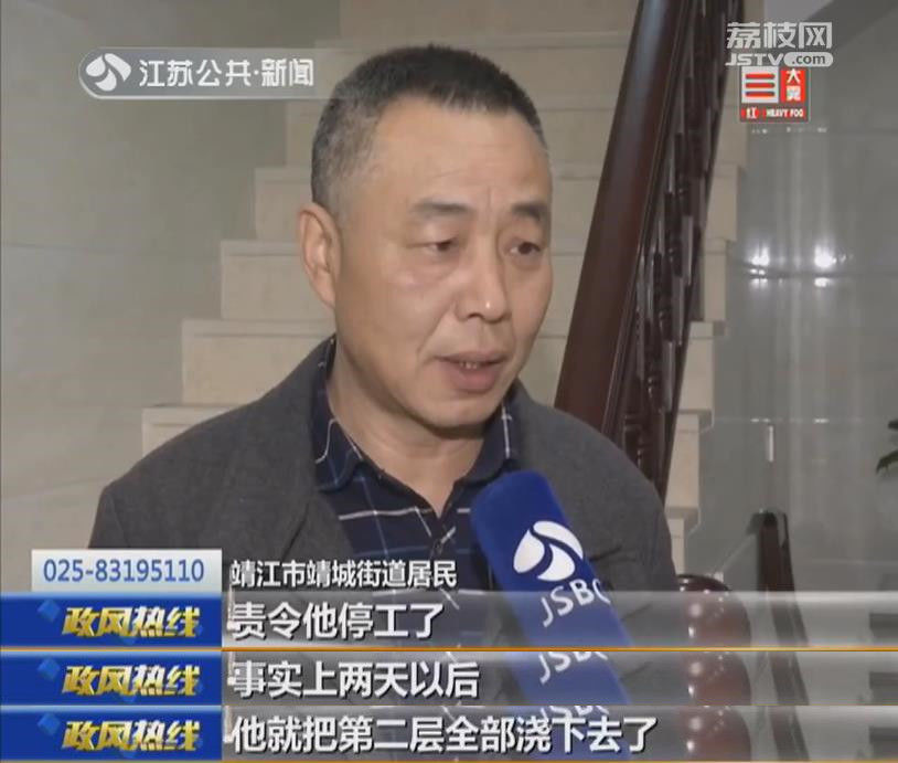靖江市靖城街道居民:“他给我的答复是责令他停工了,事实上两天以后,他就把第二层全部浇下去了,现在已经开始进入第三层,现在三层的框架已经全部搭好,准备开始浇第三层了。”