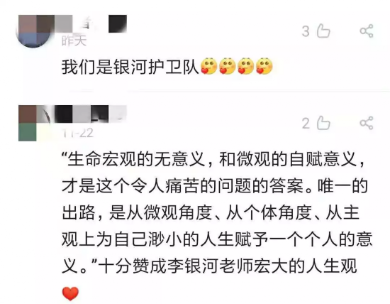 她的微博评论,关了三次,开了三次,最后索性随它去了。因为她发现,在评论区,人们开始自己讨论,还有很多人自发成立了“银河护卫队”,有愚昧错误的观点时,他们直接就去辩论了。