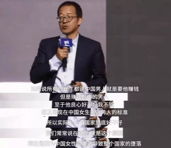 “他的话错就错在,它(中国女性)是一个全称概念,但并不是所有的。还有很多女人是很看重感情、精神生活的,她不是说要求男的你能挣钱,我就一定能嫁给你。”